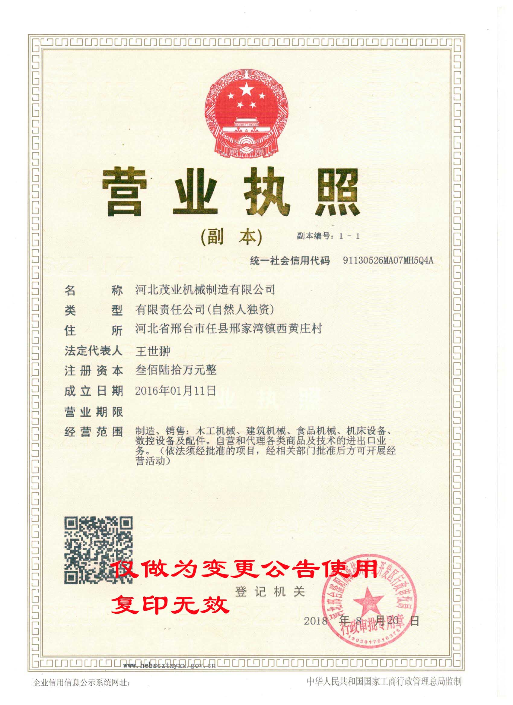 我司邢臺(tái)茂業(yè)機(jī)械制造有限公司,因公司業(yè)務(wù)發(fā)展的需要,現(xiàn)已整體變更為河北茂業(yè)機(jī)械制造有限公司,并于2018年8月20日取得河北邢臺(tái)滏陽高新技術(shù)產(chǎn)業(yè)開發(fā)區(qū)審批局頒發(fā)的營業(yè)執(zhí)照?,F(xiàn)將有關(guān)事項(xiàng)公告如下: